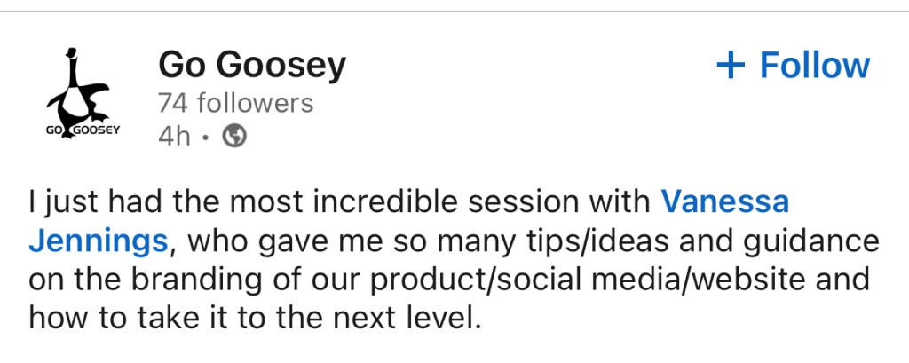 “After my 1:1 strategy session with Vanessa I can honestly say I was blown away by the number of tips and guidance she gave me. Her insight and perspective were invaluable, and you could tell she had not only deep dived into my business, socials and website to offer some brilliant ideas to take my business forward, but also gave me step-by-step action points to help make it doable.“